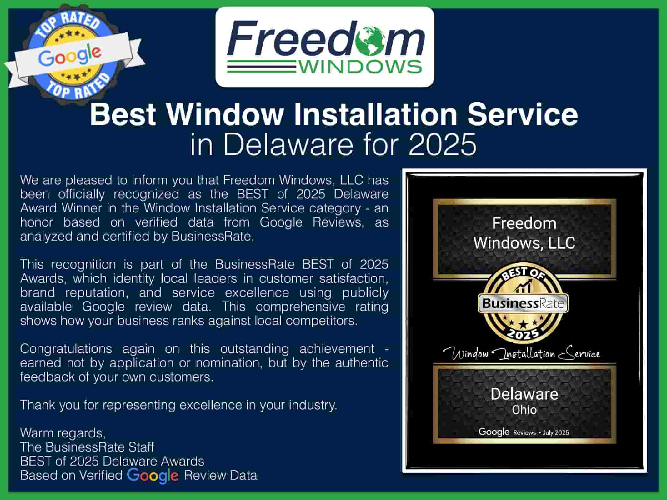 We are pleased to inform you that Freedom Windows, LLC has been officially recognized as the BEST of 2025 Delaware Award Winner in the Window Installation Service category - an honor based on verified data from Google Reviews, as analyzed and certified by BusinessRate. This recognition is part of the BusinessRate BEST of 2025 Awards, which identity local leaders in customer satisfaction, brand reputation, and service excellence using publicly available Google review data. This comprehensive rating shows how your business ranks against local competitors. Congratulations again on this outstanding achievement - earned not by application or nomination, but by the authentic feedback of your own customers. Thank you for representing excellence in your industry.