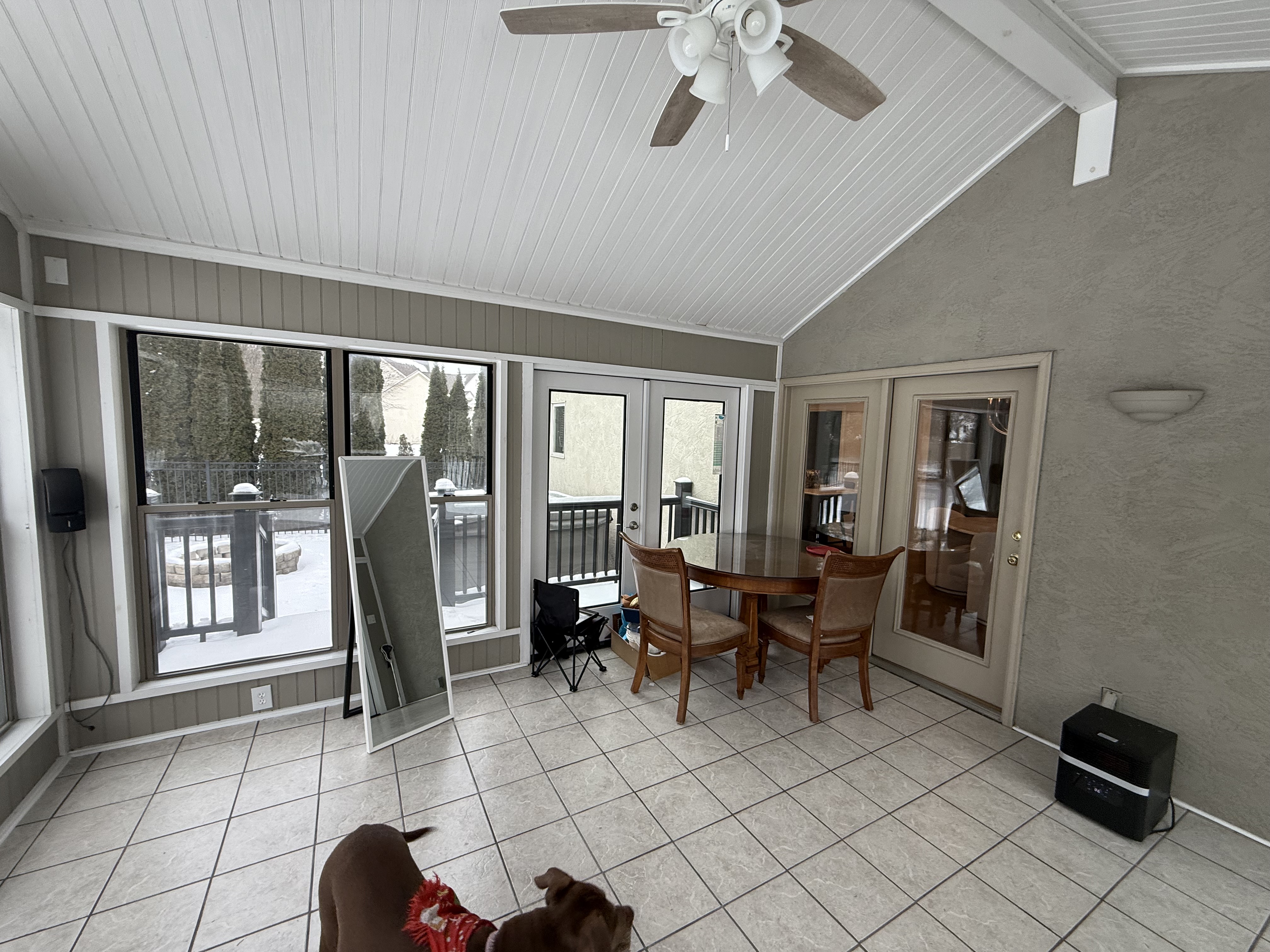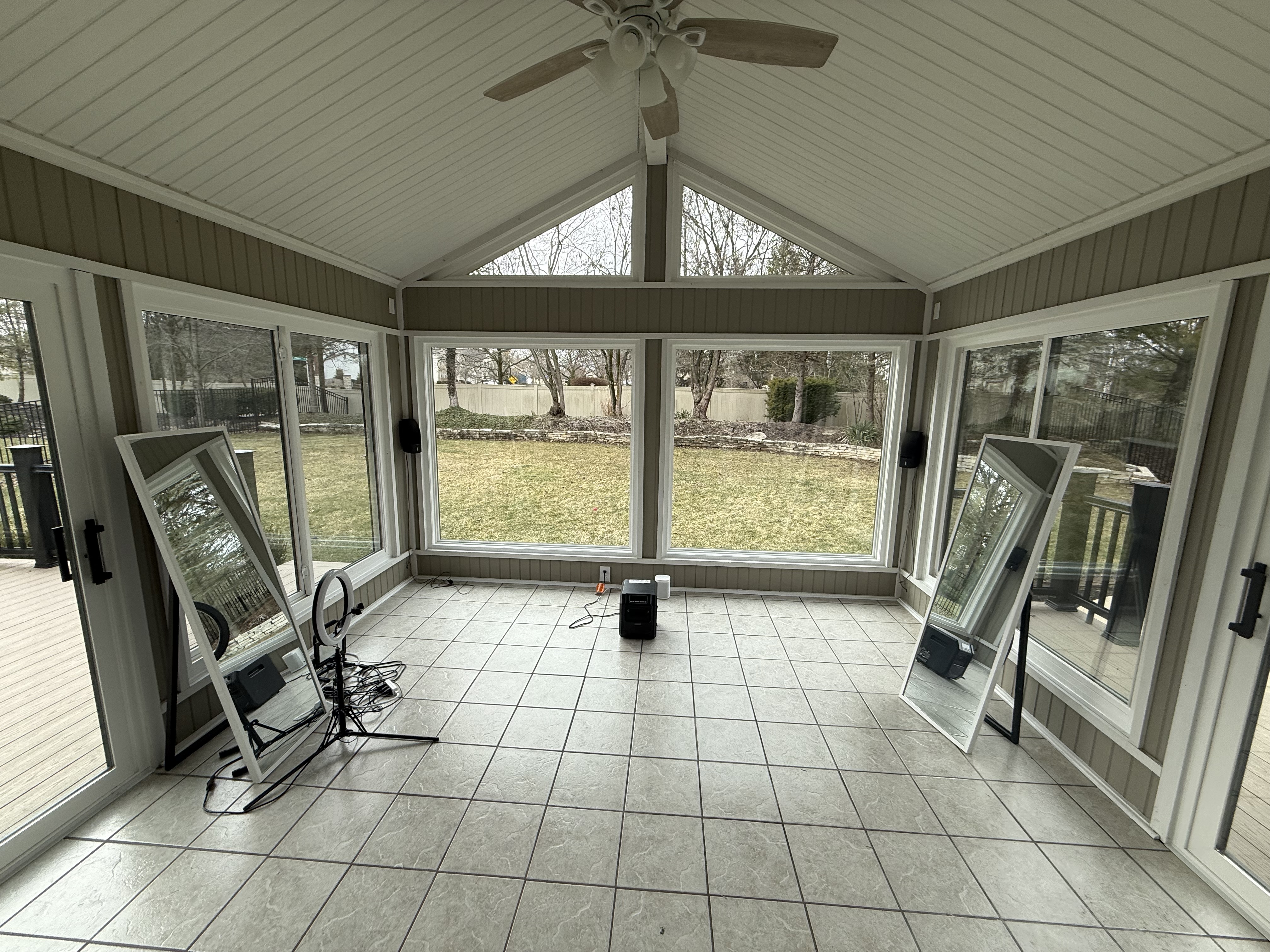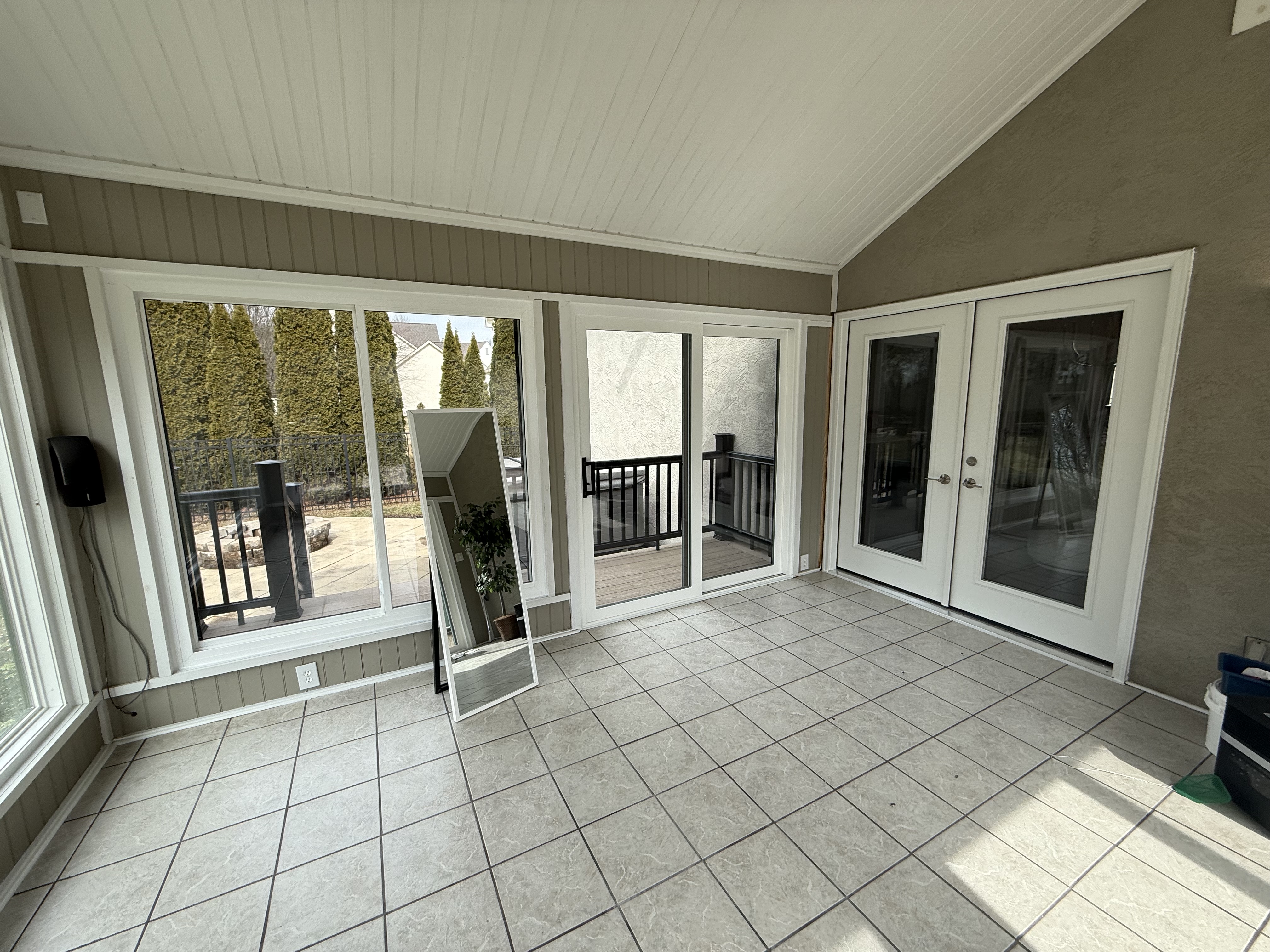 The sunroom received a complete transformation: we installed large picture windows all around to flood the space with natural light, swapped the old double doors for smooth sliding glass doors, and added a beautiful French door to the backyard for elegant access and flow.