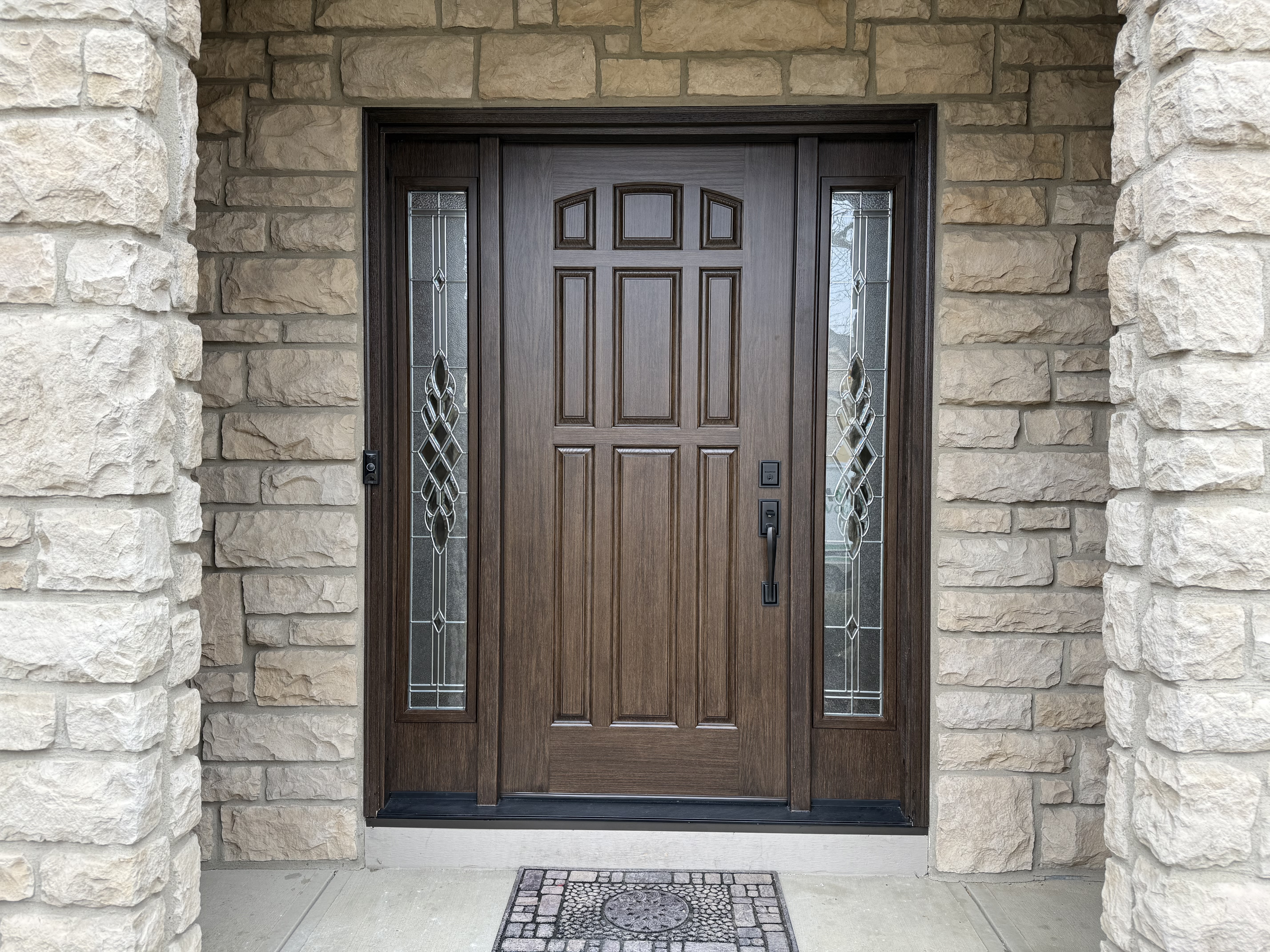 At the front, we upgraded the builder-grade steel door to a custom fiberglass entry door with realistic wood-grain texture, finished in the same striking dark bronze to match the windows and deliver that consistent, bold contrast. We topped it with updated decorative sidelights and a transom window above for added character and curb appeal.