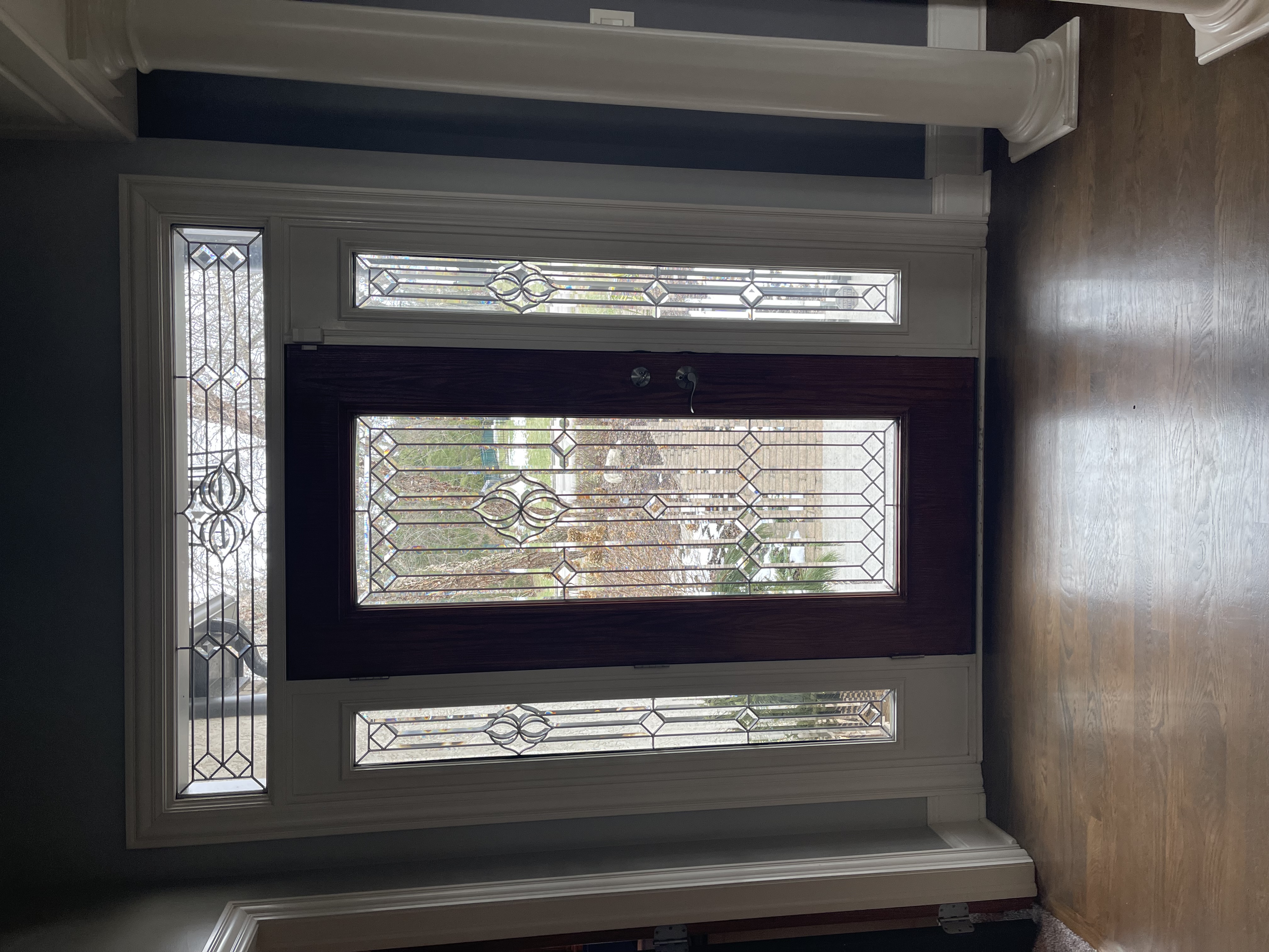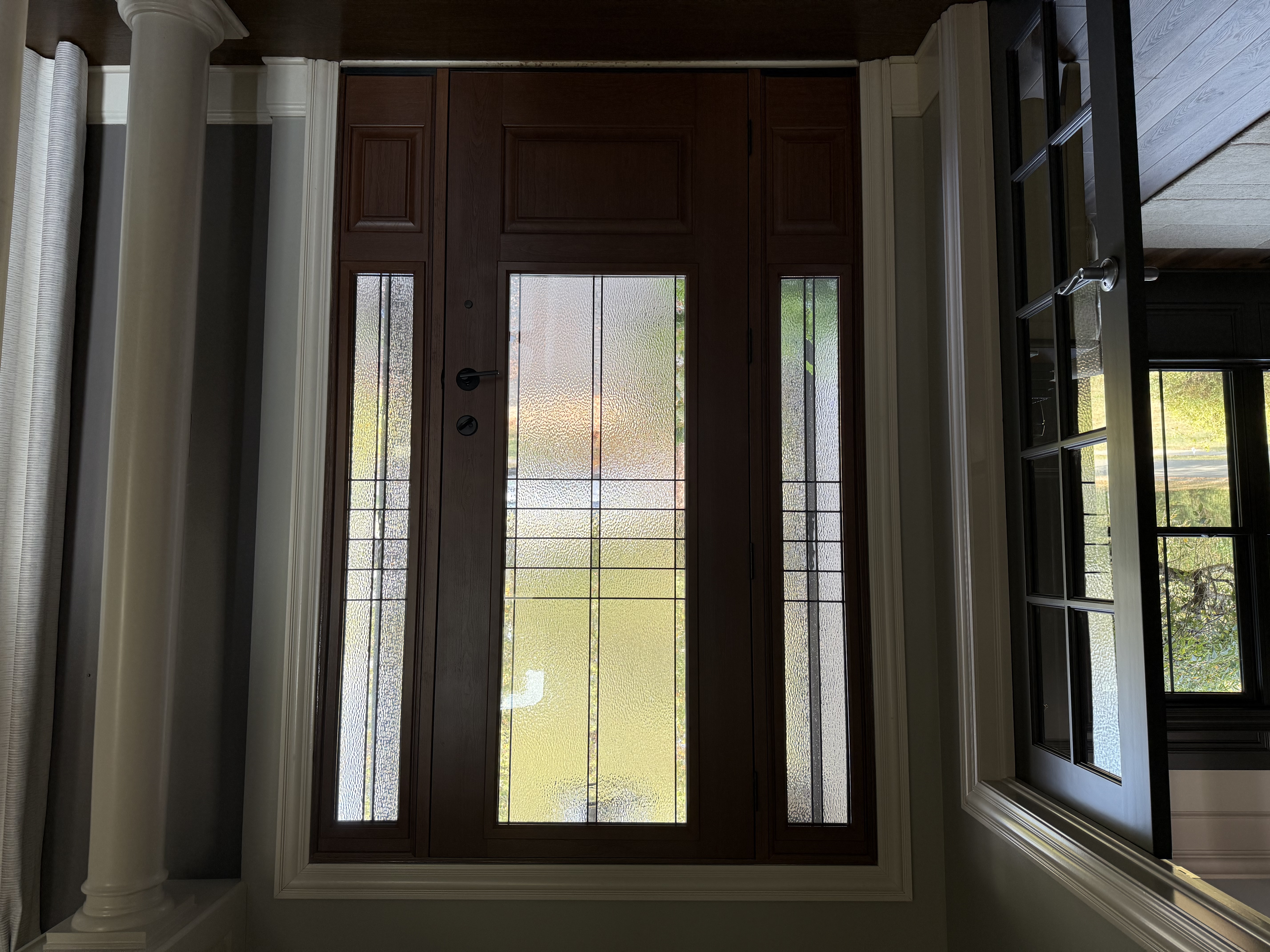 The original late-'90s/early-2000s single door with sidelights on either side and a transom above featured old decorative glass that felt dated and didn't maximize light or modern appeal. They wanted a taller, more dramatic entry... full-height glass, better flow, added privacy, and a truly standout look that would make their Powell home feel elevated from the moment guests arrive.